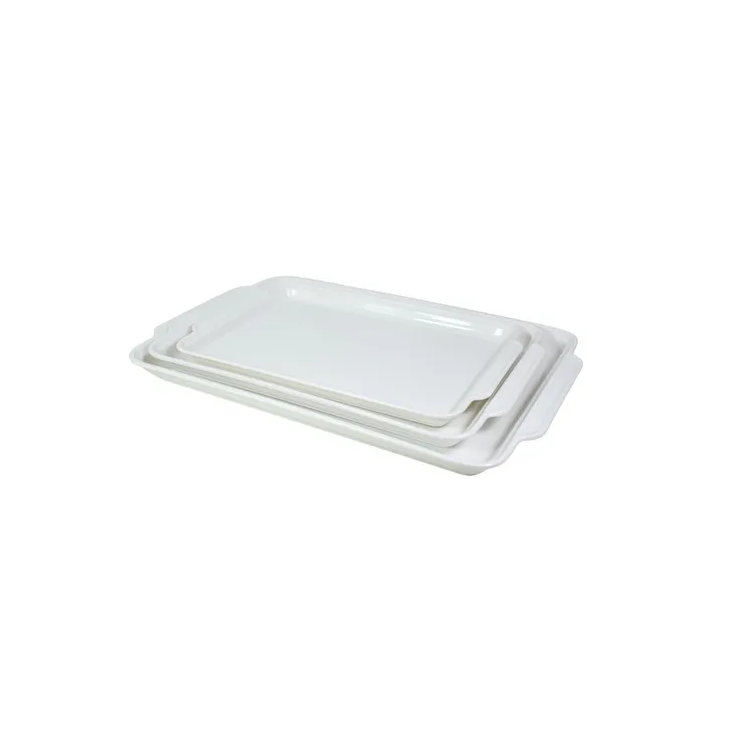 Bandejas blancas de plástico. Contiene: 3 unidades. Medidas: 46x31cm. / 40x27.5cm. / 35.5x24cm. En caja.