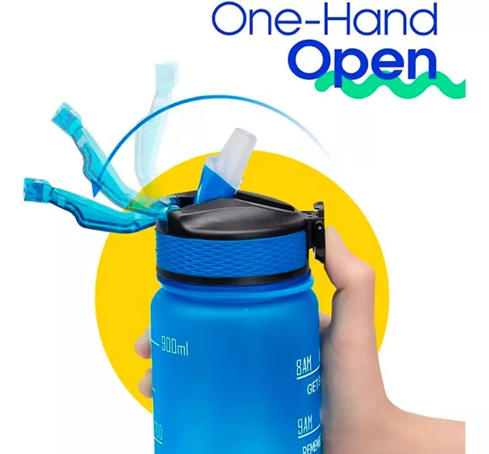 Botella de agua de gran capacidad de 1L con cubierta de rebote, a prueba de fugas con recordatorio de escala de tiempo Diseño motivacional: le da motivación, le recuerda que debe mantenerse hidratado y beber suficiente agua durante todo el día. Volumen-marcadores de las horas del día muy adecuados para medir el consumo diario de agua. Apertura de un botón: Abra el pico con una mano para beber fácilmente. Pajita de silicona: Tiene una pajita de silicona emergente. Boca ancha: La boca ancha diseñada hace que sea fácil llenar la botella deportiva con hielo y agua. Cómodo de llevar: La botella tiene una correa, es ligero y se puede llevar fácilmente a actividades al aire libre. Características: Material: PC, PP, silicona de calidad alimentaria. Colores varios sujetos a disponibilidad. Tamaño: 30,0x8x8 cm. Peso: 200g.