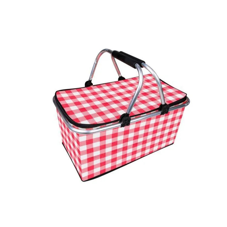 Canasta cesta térmica plegable para picnic. Medidas: 46x26x22cm. confeccionada en Oxford + espuma EPE + lámina de aluminio. Impermeable y antihumedad, con patrón de cuadros clásico. Revestimiento de membrana de aluminio de aislamiento térmico. Estructura de aluminio, plegable. En bolsa.