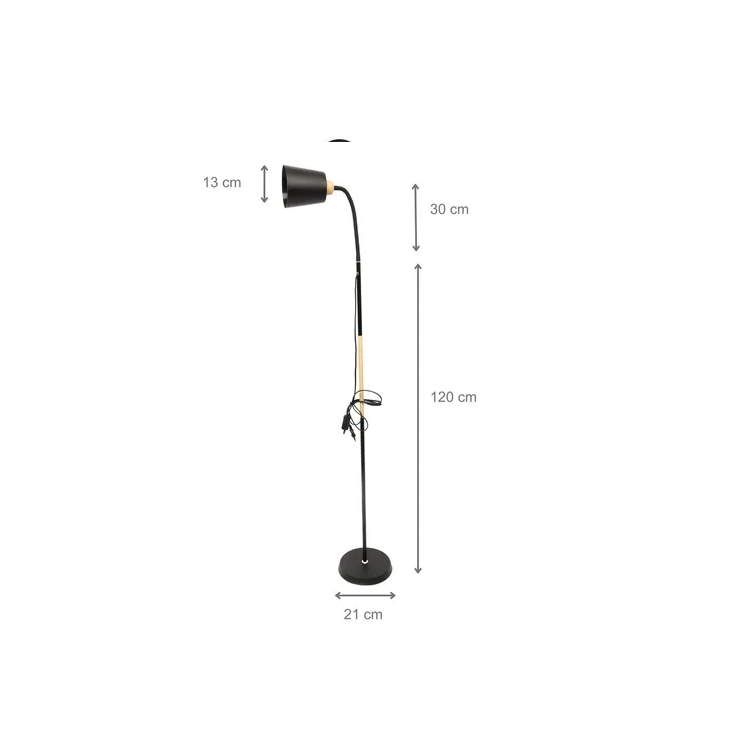 .: CARACTERÍSTICAS DEL PRODUCTO :. - Lámpara de pie estilo nórdico - Brazo flexible de tubo blanco en su último tramo para adaptar la dirección del foco a gusto. - Pantalla de lámpara con cubierta de PVC Detalles en madera pulida - Base redonda de hierro forjado - Fracciones de la estructura en metal y madera pulida - Cable de 220V certificado largo aproximado de 130 cm - Interruptor simple On/Off - Medida de rosca de foco convencional E27 Voltaje 220V - Rango de alcance: de 5 a 8 m2 - El color del cable está en juego con el color de la lámpara