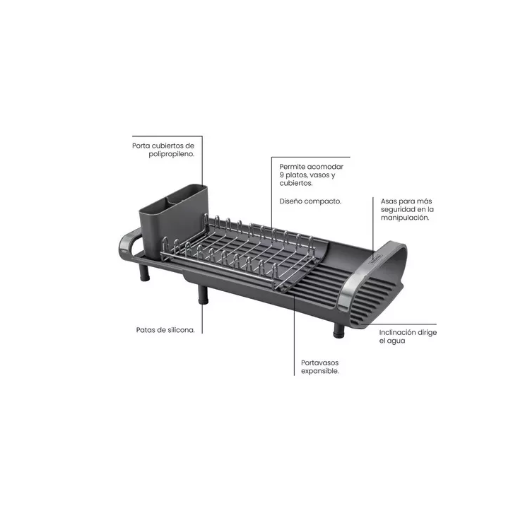 Escurridor de platos extensible. Marca: Tramontina. Medidas: 44x30x16cm. Capacidad 9 platos Porta cubiertos removible. Bandeja retractil. Material: polipropileno y acero inoxidable.